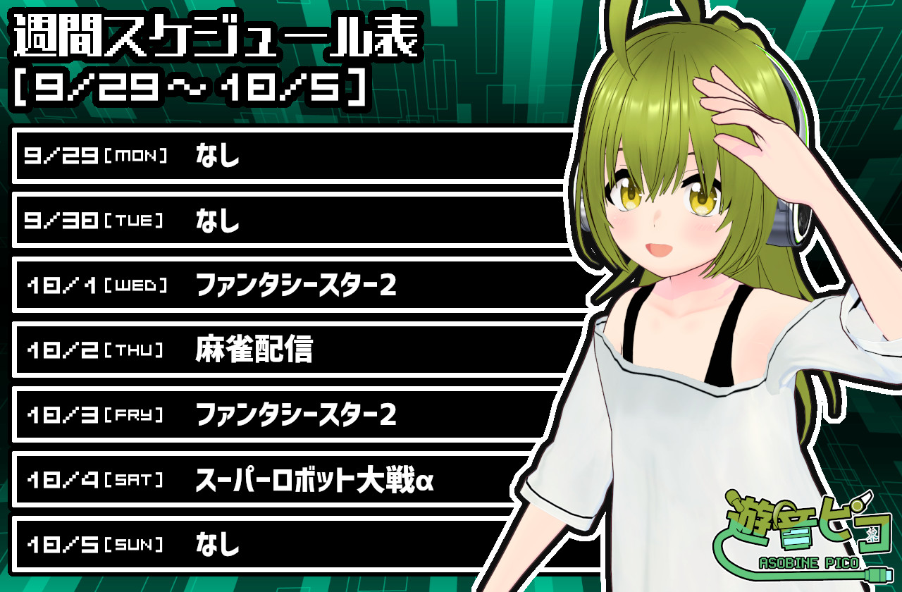 9/29~10/5の配信スケジュール 配信スケジュール X Facebook はてブ LINE コピー 2025.09.30 ※いずれも22時過ぎ頃から開始 今週は通常通りの配信日となります。 ※9月下旬よりボイチェン勢になりました 土曜のスパロボαは随分と間が空いてしまいましたが遂に最終話「この星の明日のために」を攻略していきます。 連戦マップとなりますが果たして速やかにクリア出来るのか…!?