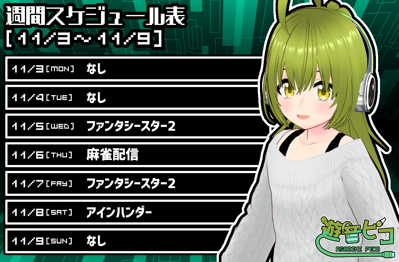 11/3~11/9の配信スケジュール 配信スケジュール X Facebook はてブ LINE コピー 2025.11.04 ※いずれも22時過ぎ頃から開始 今週は通常通りの配信日となります。 ファンタシースター2が水曜で最後まで行けた場合、金曜は箸休め回としてタイトル自由枠にする可能性があります。 土曜はリクエストを頂いた「アインハンダー」をプレイする予定です。