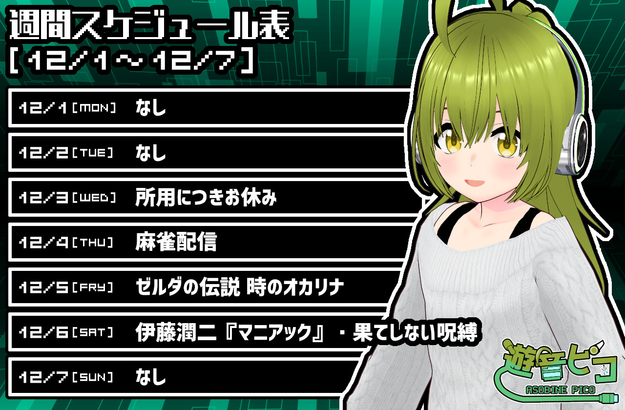12/1~12/7の配信スケジュール 配信スケジュール X Facebook はてブ LINE コピー 2025.12.02 ※いずれも22時過ぎ頃から開始 今週は水曜に用事があるため木曜の麻雀配信からスタートです。 土曜はリクエストを頂いた「伊藤潤二『マニアック』・果てしない呪縛」をプレイする予定です。 ボイチェンにしてから初の真っ当なホラーゲーム枠となりますが果たして悲鳴を上げる事はあるのか…!?