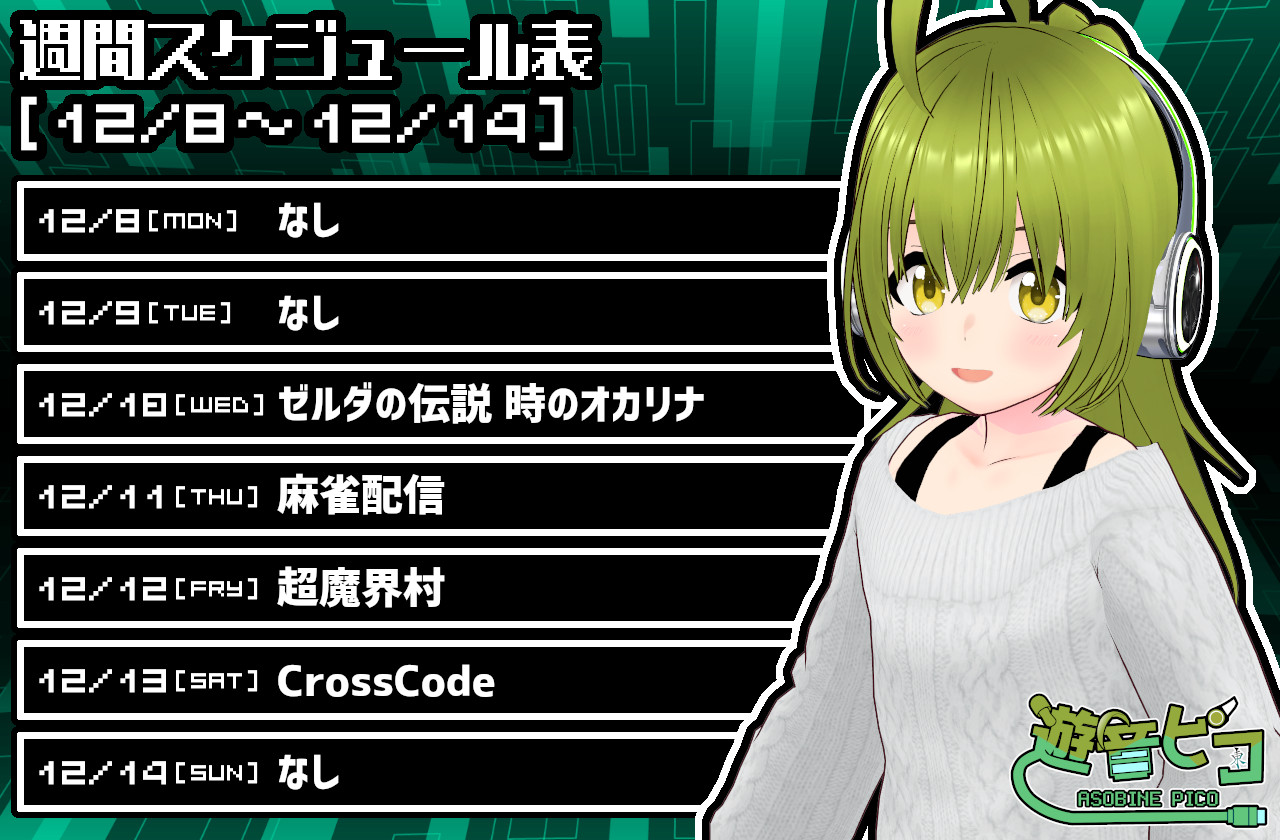 12/8~12/14の配信スケジュール 配信スケジュール X Facebook はてブ LINE コピー 2025.12.09 ※いずれも22時過ぎ頃から開始 今週は通常通りの配信日です。 金曜と土曜はそれぞれリクエストを頂いた「超魔界村(2周目)」と「CrossCode」をプレイする予定です。 超魔界村は代わりにプレイする事も可能なので我こそは!という方は是非その腕前を披露して下さい!