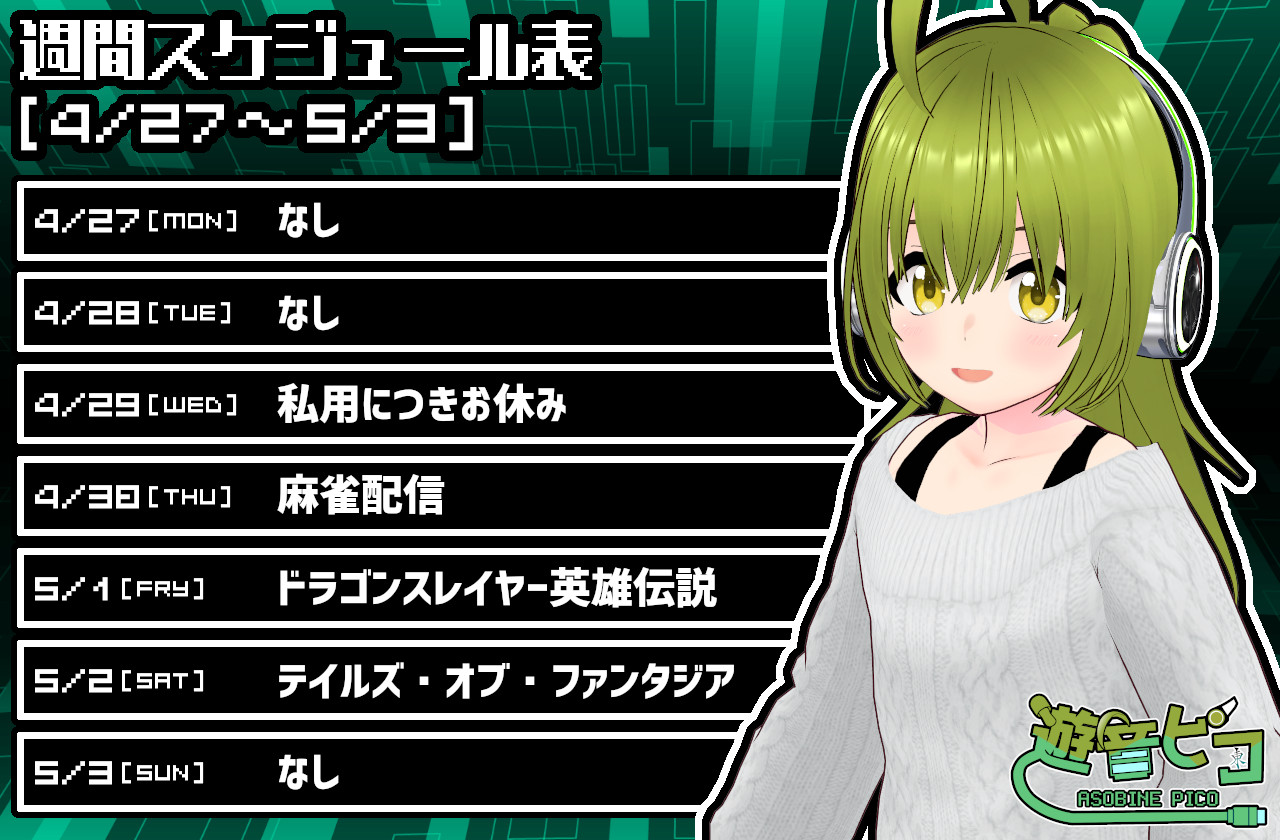 4/27~5/3の配信スケジュール 配信スケジュール X Facebook はてブ LINE コピー 2026.04.27 ※いずれも22時過ぎ頃から開始 今週は私用のため木・金・土の配信となります。 土曜はリクエストを頂いた「テイルズ・オブ・ファンタジア」のお試しプレイをする予定です。 今の今までやって来なかったテイルズシリーズに遂に手を出します。